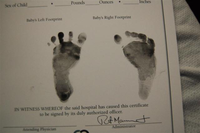 As I said the other day, I won’t set any goals for November since I had a baby on the way. Well, the little guy had other plans than being a Thanksgiving baby. He wanted to be a Election Eve baby. Conner James came into the world at 6 pounds 10 ounces and 19 inches long. Since this is a running blog, I thought I’d share his impressive footprints for such a little guy. Mom and baby are doing great so far and got to come home a few hours ago.