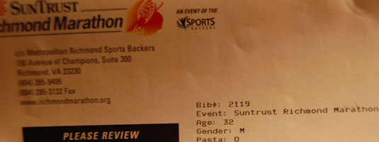 I got a special piece of mail today — my bib number for the Richmond Marathon. I looked it up on the Internet and didn’t find too much … except a bunch of addresses, including 2119 The Inn – Covington, a bed and breakfast in a town in George that I know nothing about. 2119 is also House Bill 2119 in Washington State, a bill introduced last year on “expanding dual credit opportunities” that was eventually signed into law.