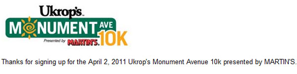 When it comes to running, my dancing around on what’s next is over. I signed up tonight for the Ukrop’s Monument Avenue 10k presented by Martin’s in Richmond on April 2. (This will be the one and only time I mention the name in full.) For those not familiar with this race, the Monument Avenue 10k has expanded registration to 40,000 people this year, making it one of the largest 10ks in the country and putting it in the top 25 races in the country as far as size. It’s also been one of the top “10 greatest places for runners to hit the road.”