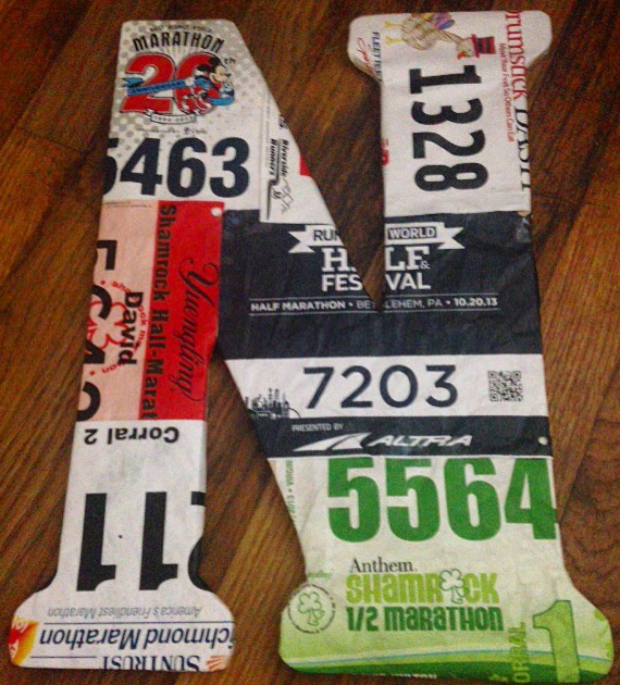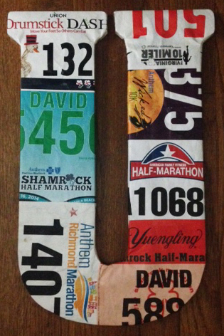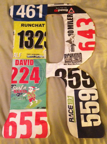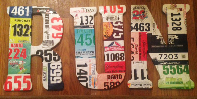 “THIS” was a project to do something with some of my running bibs that I have no use for. My idea was to buy letters that spelled “run” and put race bibs on them.